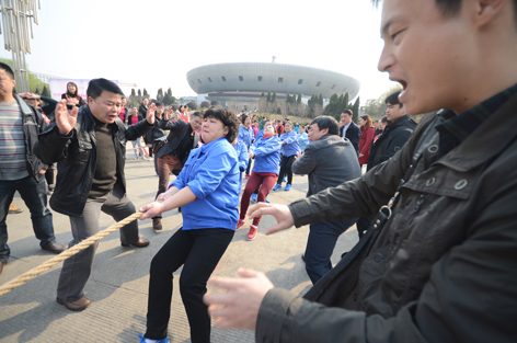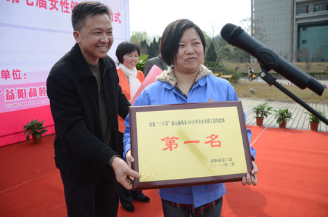 3月7日,在益阳市总工会举办的 “庆祝三.八节,展示新风采”拔河比赛中,公司女工拔河队在16支参赛队伍中,力压群雄,勇夺冠军,展示了公司女工的风采。 上图为公司拔河选手在奋力拼搏;下图为公司女工委员李宪上台领取奖牌。