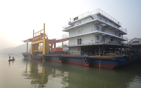 1月12日,由中海公司建造的目前国内内河最大的(长狸8)抛石工作船在礼花绽放声中顺利下水。该船为长江航道局抛石工作船,主要担负长江航道治理的水下抛石任务。图为下水后的(长狸8)抛石工作船。