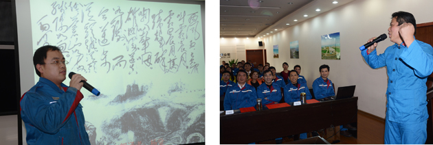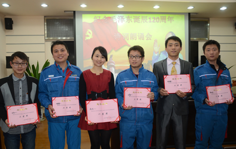 12月13日,公司团委举办毛泽东经典诗词朗诵比赛,拉开了纪念毛泽东同志诞辰120周年系列活动的序幕。来自7个团支部的18名团员青年满怀深情、慷慨激昂地朗诵了毛泽东同志的《沁园春?雪》、《念奴娇?昆仑》、《七律?长征》、《水调歌头?重上井冈山》等脍炙人口的作品。 上图为一等奖获得者周巧(左三),二等奖获得者刘雄伟(左二)和郑良明(右二),三等奖获得者陈力刚(右一)、王泽才(右三)与王飞(左一)合影;下图左为杨觉在朗诵,下图右为刘雄伟在朗诵。