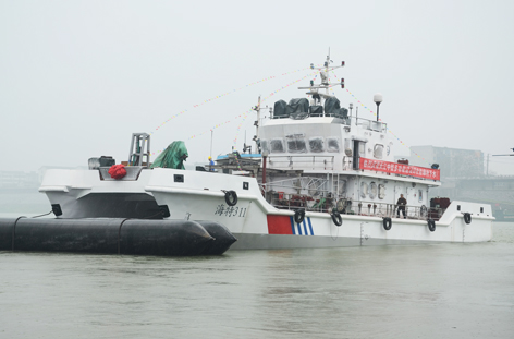 4月10日,由中海公司建造的首艘30米级多功能溢油回收船在轻快的音乐和礼花绽放声中顺利下水。该船为长江船企设计院设计,长江海事局订购,是目前长江流域第一条多功能溢油回收船,将主要负责长江江苏段水域船的溢油事故的应急处理。图为正在下水的30米级多功能溢油回收船。