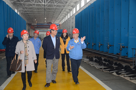 12月7日,台湾建大轮胎公司副董事长杨启仁一行,在益阳市人大常委会副主任徐云波的陪同下来公司考察,公司董事长兼总经理张俊山、副总经理姚宏建等陪同参观。图为张俊山(右一)向杨启仁(右二)一行介绍公司生产经营情况。