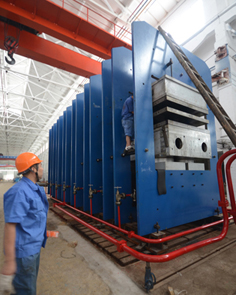 公司紧盯住国内外市场最新发展动向,在平板硫化机向超长 、超宽发展的同时,积极开发高效节能的平板硫化机新产品。7月初,由公司自主研制的1.8×10米双层平板硫化机新产品试车成功。图为试车现场。