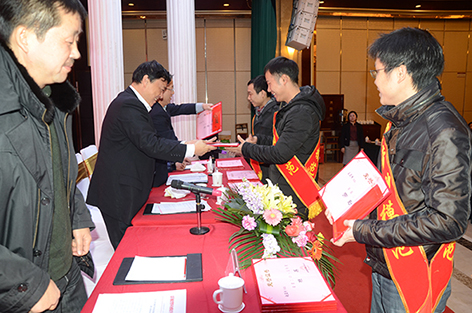 在副总经理刘孟辉宣读表彰决定和名单后,公司领导分别为获得2015年先进集体、先进班组以及劳模、标兵、青年突击手颁发证书和奖金。