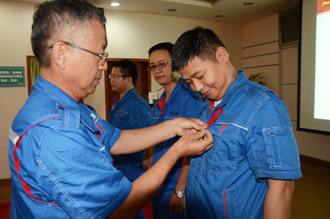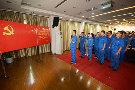 接着,玄书鹏同志宣读新批准的预备党员名单与预备党员转为正式党员名单。公司党委委员、常务副总经理姚宏建为四位按期转正的党员佩戴党徽。在玄书鹏同志的带领下,四位预备党员面向党旗光荣宣誓、与会的老党员重温入党誓词。