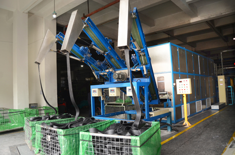 其中,新型耐磨环的密封装置采用C-C复合材料,性能自润滑,不需要添加任何油料,不但可以避免油料对胶料及环境的污染,单台串联密炼机每天还可节省油料约40%以上。同时,采用串联式密炼机布置,炼胶生产线不但空间占用少,节省土建投资,而且一个班组即可完成母炼、终炼两道工序,可减少一半人员配置。 智能化开炼机机组,可变速、变间隙,高速补充混炼效果好,而且翻胶、捣胶实现自动化无人操作,具有自动连续出片功能。在线自动滤胶机,滤胶温升小,滤胶前后胶料门尼粘度变化小,可极大提升滤胶的品质。生产过程中不产生烟气,可保持过滤现场较好的作业环境。在胶片冷却和出片工艺环节,胶片经滤胶机自动分成三等份三条线路进行反复冷却,最后产出的胶片完美匹配符密封件硫化的尺寸要求。