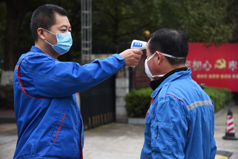 复工期间,公司严格履行防控责任,通过多种途径防疫情、保生产。一是加强用餐管理,实行分批就餐制,取食和就餐时保持一米距离;二是上班期间由专人负责对员工进行统一测量体温并记录,测量仪器由专人进行消毒保管;三是严禁一切外来无关人员进入厂区,确需进入的,必须报备主管部门经同意并检测体温正常后方可进入。