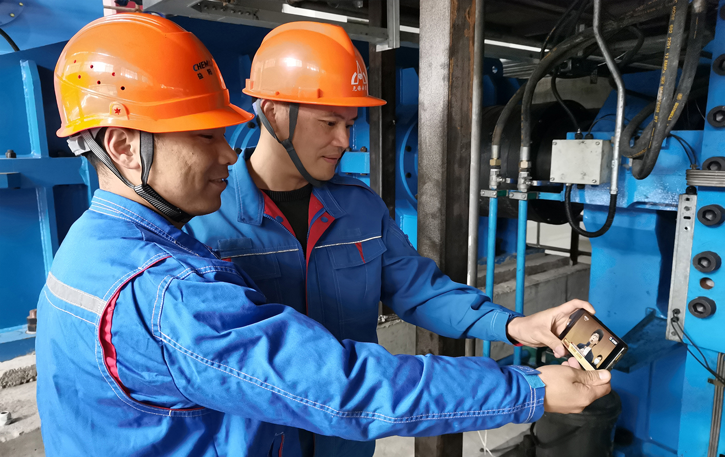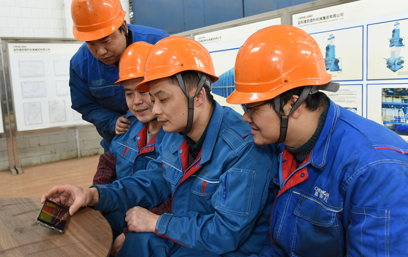 ▲在客户处安装调试密炼机的装配钳工利用工作空隙观看两会开幕式