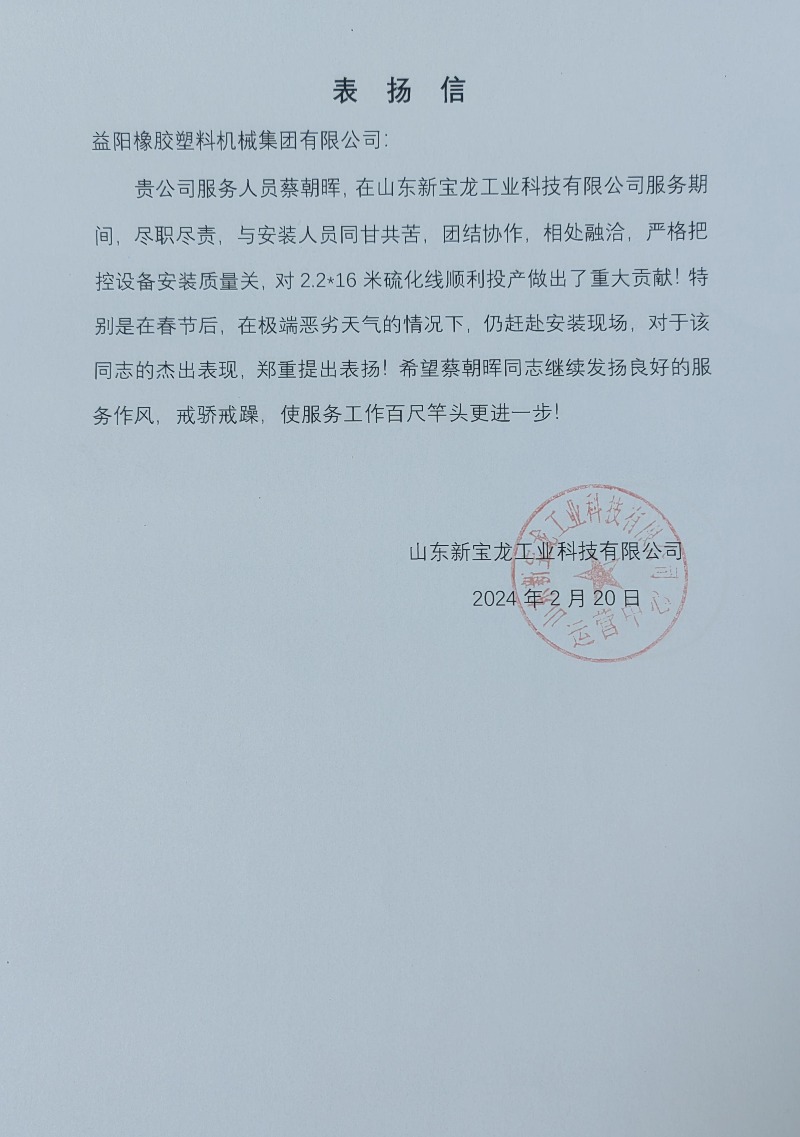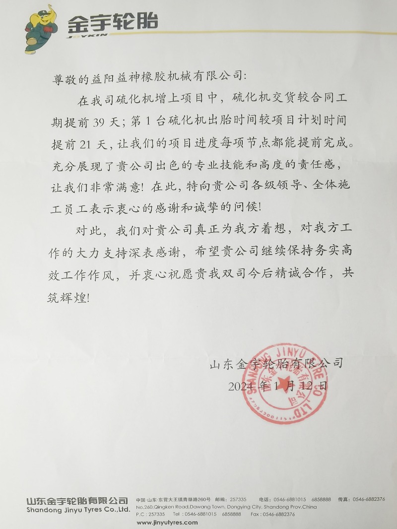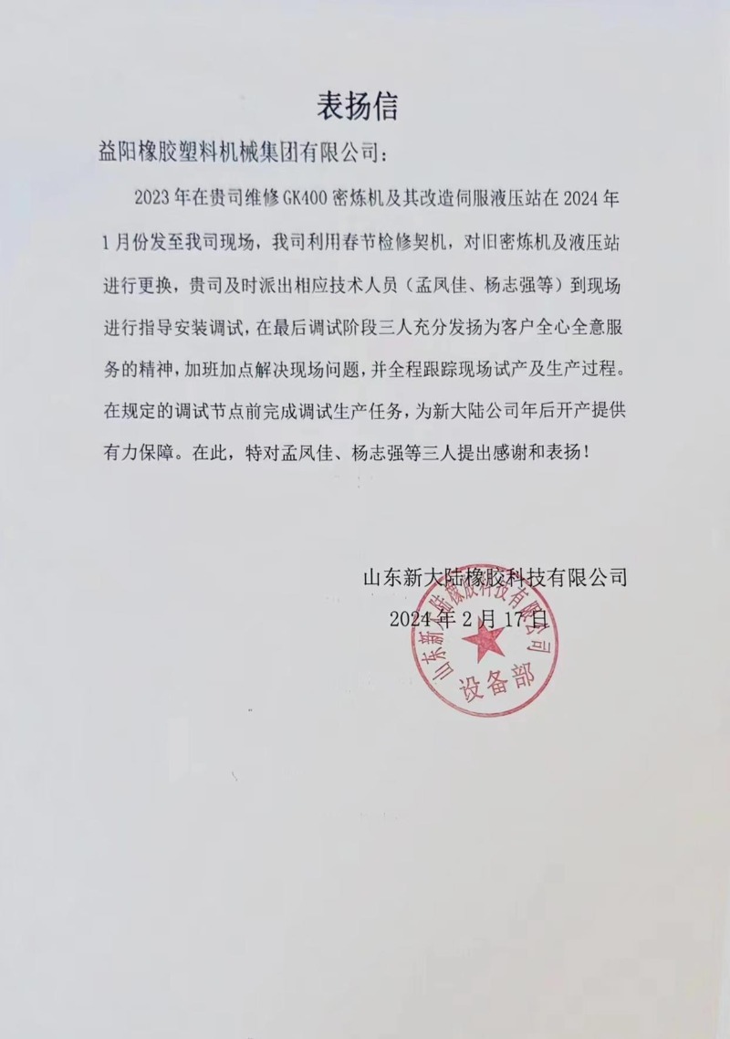益阳橡机在收到金宇轮胎的感谢信后,又相继收到山东新大际和山东新宝龙的表扬信,信中对公司高质高效的产品服务的充分信任溢于言表。感谢客户对公司的这份支持和认可,这也将是益阳橡机努力前行的动力源泉,以更环保节能、低碳高效的橡胶机械产品回报客户、回报市场。