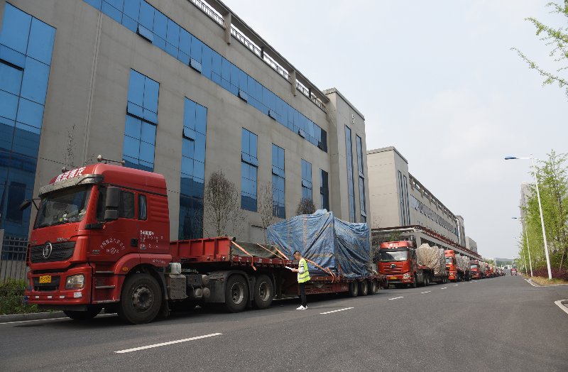 ▲图为公司厂区内一辆辆装满密炼机、硫化机产品的货车正整装待发。